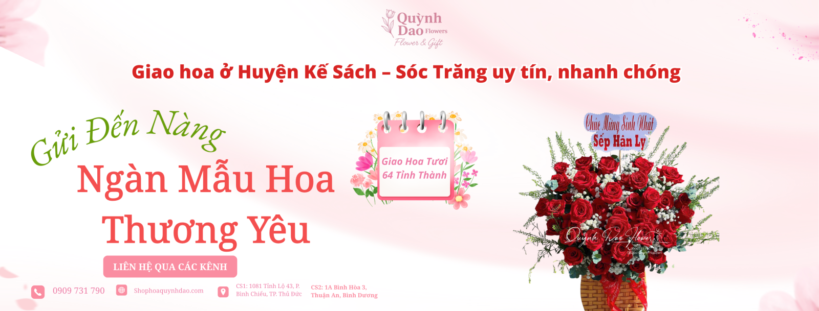 Huyện Kế Sách là một trong những khu vực có đời sống văn hóa gắn liền với các dịp lễ, kỷ niệm, thăm hỏi và chúc mừng. Nhu cầu đặt hoa tươi tại Kế Sách ngày càng tăng, không chỉ trong phạm vi địa phương mà còn đến từ khách hàng ở các tỉnh thành khác muốn gửi hoa về Sóc Trăng cho người thân, đối tác. Hiểu được điều đó, Hoa Quỳnh Dao mang đến dịch vụ giao hoa ở Huyện Kế Sách – Sóc Trăng với quy trình chuyên nghiệp, đảm bảo hoa đẹp, đúng mẫu và giao đúng thời gian.