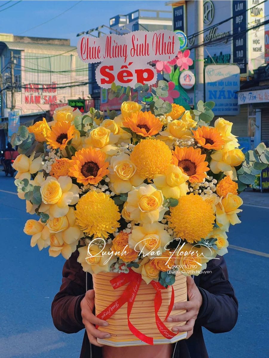 Giỏ hoa vàng tượng trưng cho niềm vui, sự lạc quan và thịnh vượng. Với thiết kế giỏ hoa to, màu sắc hài hòa, đây là lựa chọn phù hợp cho các dịp khai trương, chúc mừng hay tri ân.
