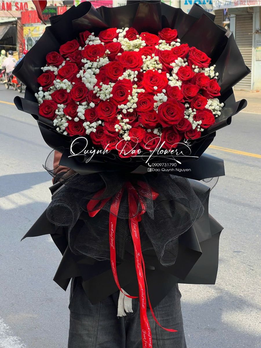Tone đỏ đen mang ý nghĩa mạnh mẽ, sang trọng và nổi bật, phù hợp cho các dịp chúc mừng, kỷ niệm hoặc tặng người yêu. Mẫu bó hoa này được thiết kế tinh tế, tạo ấn tượng ngay từ cái nhìn đầu tiên.