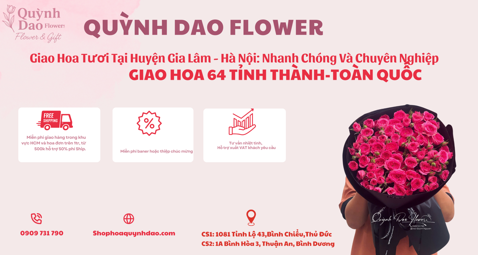Shop Hoa Quỳnh Dao cam kết giao hoa tươi huyện Gia Lâm Hà Nội nhanh chóng, đúng giờ, mẫu mã đa dạng và giá cả hợp lý, giúp bạn gửi gắm trọn vẹn tình cảm đến người nhận.