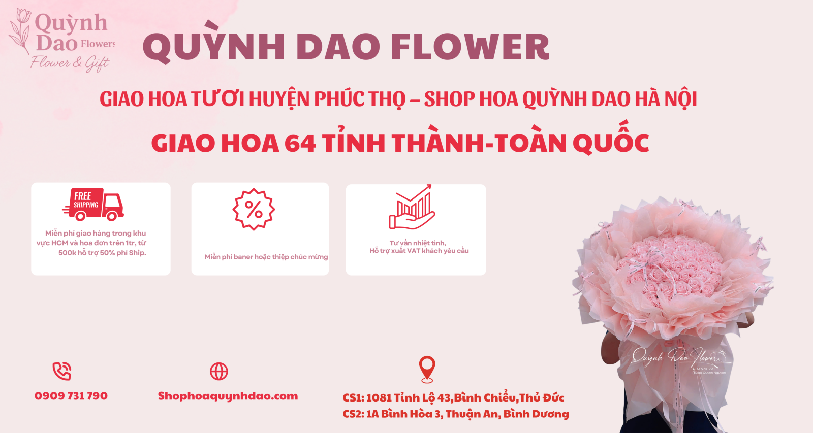 Nếu bạn đang tìm kiếm shop hoa tươi uy tín tại Huyện Phúc Thọ, thì Shop Hoa Quỳnh Dao là địa chỉ lý tưởng. Với nhiều năm kinh nghiệm cung cấp hoa tươi chất lượng cao tại TP. Hồ Chí Minh, Bình Dương và Hà Nội, Quỳnh Dao tự hào mang đến dịch vụ giao hoa tận nơi nhanh chóng, chuyên nghiệp và đúng yêu cầu khách hàng.