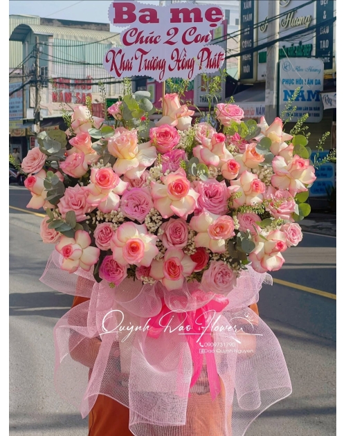 Hoa khai trương: Kệ hoa lớn, sang trọng, thiết kế theo tone màu may mắn.