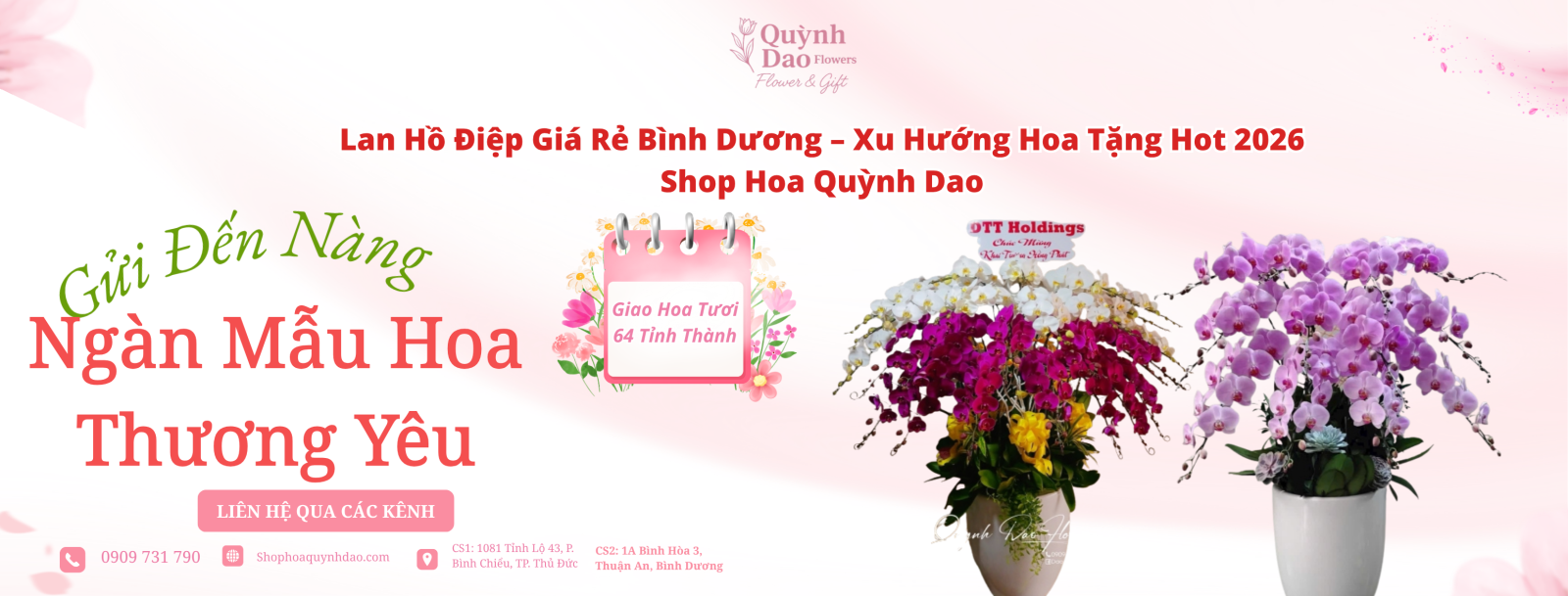 Với đa dạng mẫu mã, thiết kế hiện đại và dịch vụ chuyên nghiệp, Shop Hoa Quỳnh Dao chính là địa chỉ uy tín giúp bạn gửi gắm những thông điệp ý nghĩa qua từng chậu lan hồ điệp.