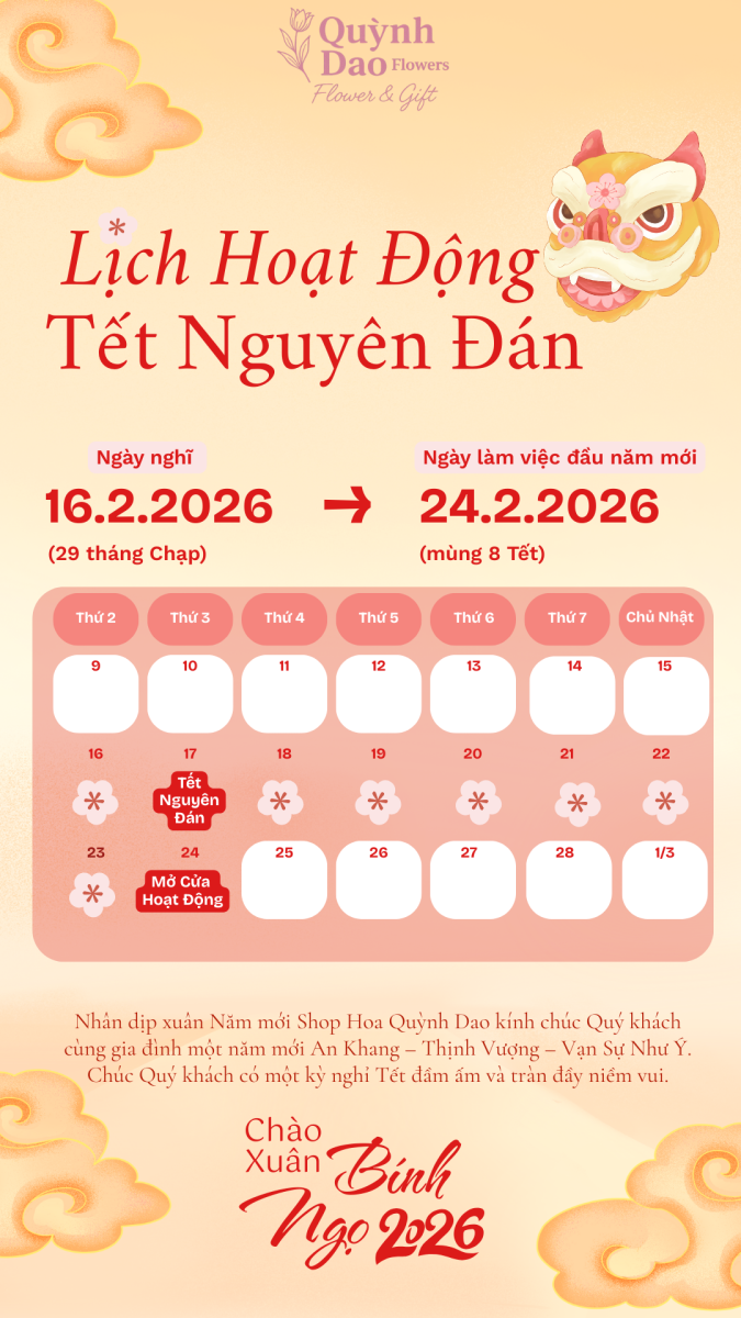 Trong thời gian nghỉ Tết, cửa hàng tạm ngưng hoạt động bán hàng trực tiếp và giao hoa. Các kênh liên hệ có thể phản hồi chậm hơn so với ngày thường. Kính mong Quý khách thông cảm.