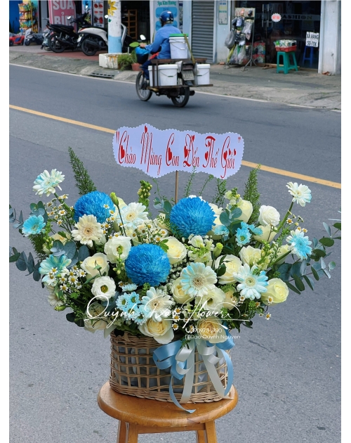 Giỏ hoa xanh dương là lựa chọn lý tưởng cho những ai muốn gửi gắm sự tinh tế và nhẹ nhàng đến người nhận.